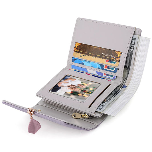 Small Wallet for Women PU Leather RFID Blocking Card Holder Zipper Coin Purse with Leaf Pendant(Purple)